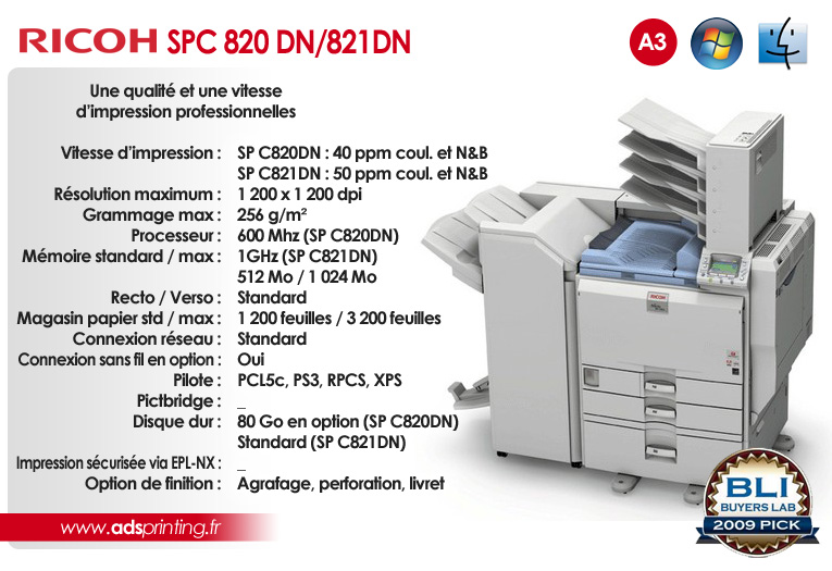 - SP C820DN : 40 ppm coul. et N&B - SP C821DN : 50 ppm coul. et N&B - Grammage max. : 256 g/m² - jusqu'à 3200 feuilles - Impression recto / verso