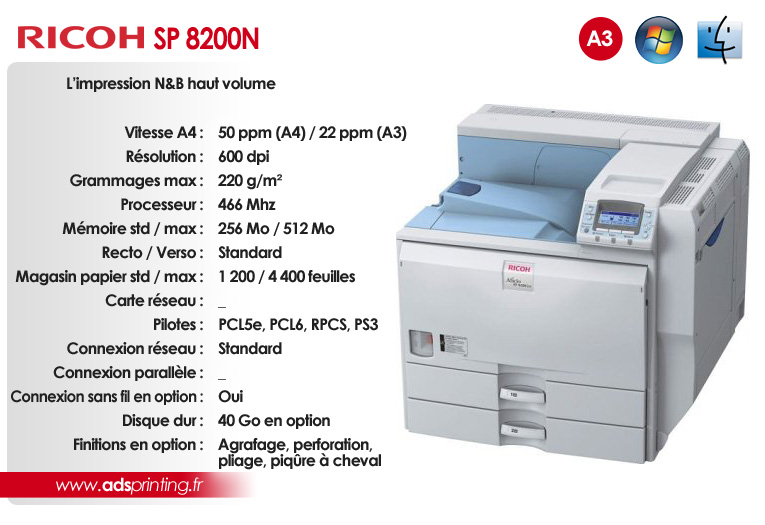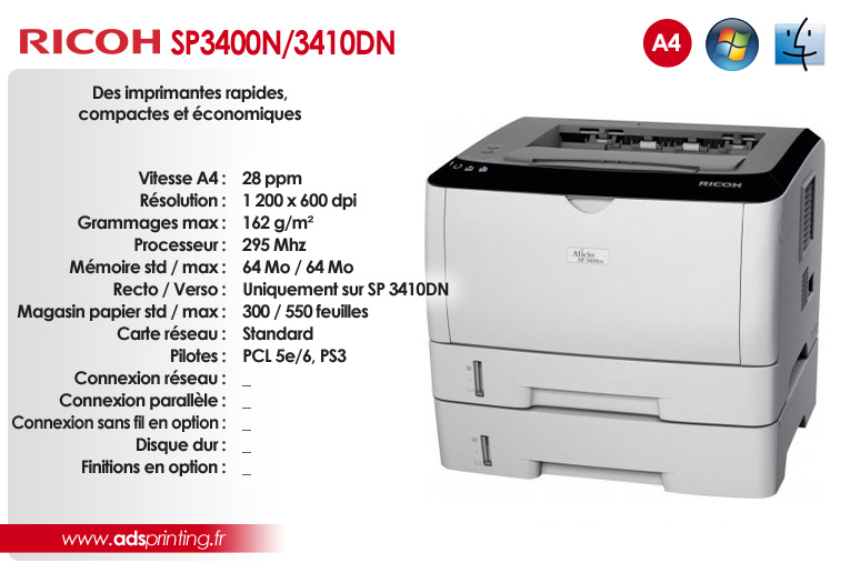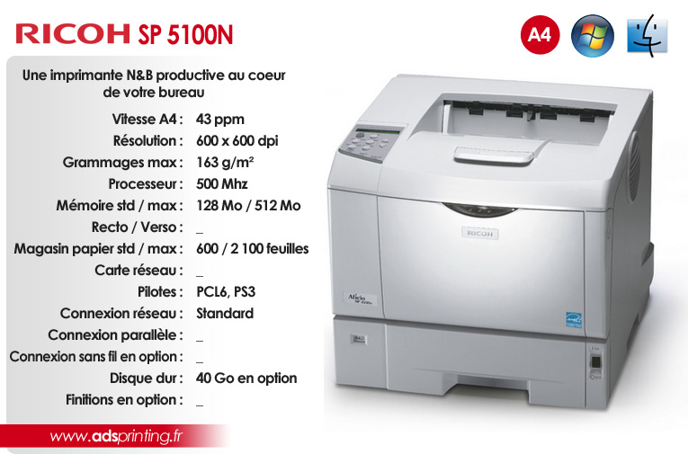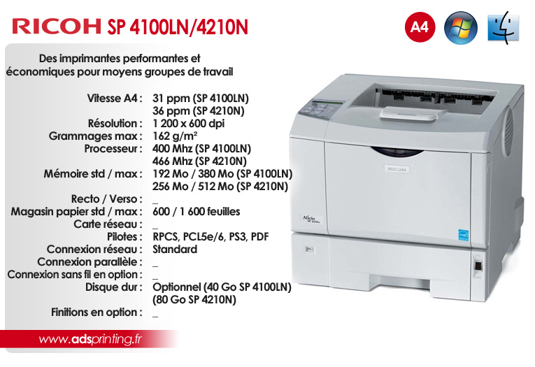 - 31 ppm (SP 4100LN) - 36 ppm (SP 4210N) - Grammage max. : 162 g/m² - Magasin jusqu'à 1600 feuilles