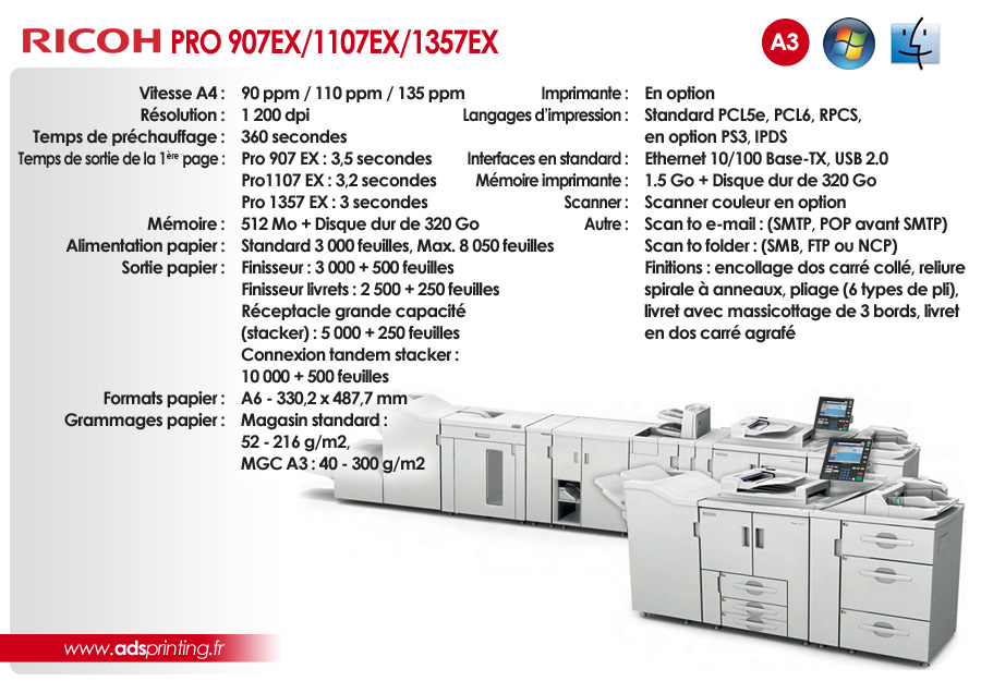 - 60 ppm / 70 ppm / 80 ppm / 90 ppm - Grammage max. : 216 g/m² - jusqu'à 8300 feuilles - Impression recto / verso